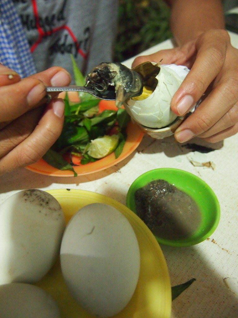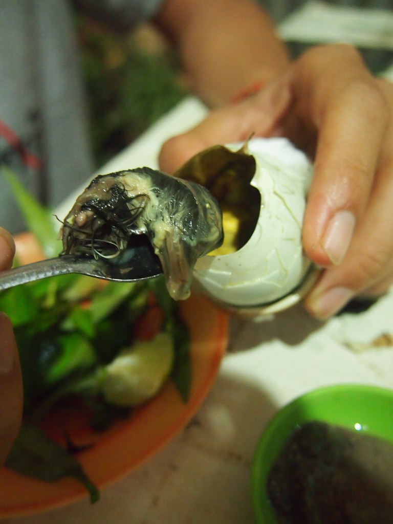 So Pong Tia Koun is a 14 to 21 days old egg boiled, with partially formed duck still inside. The fetus is not really formed and you cannot easily see it without pulling apart the egg. It is usually served with pepper, garlic, chilli sauce, laksa leaves and lemon juice.